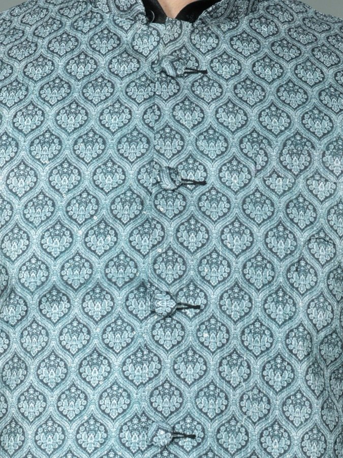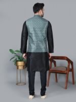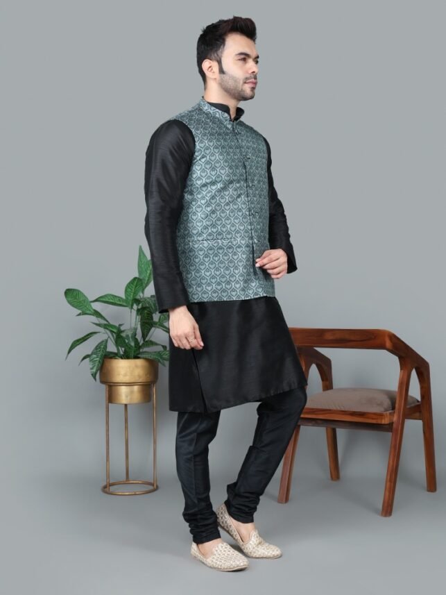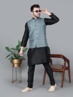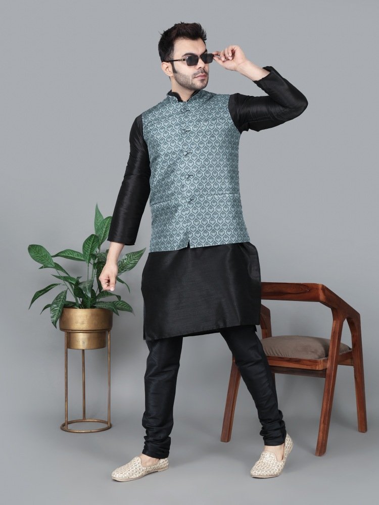 Men’s Black Kurta Churidar with Gray Printed Waistcoat