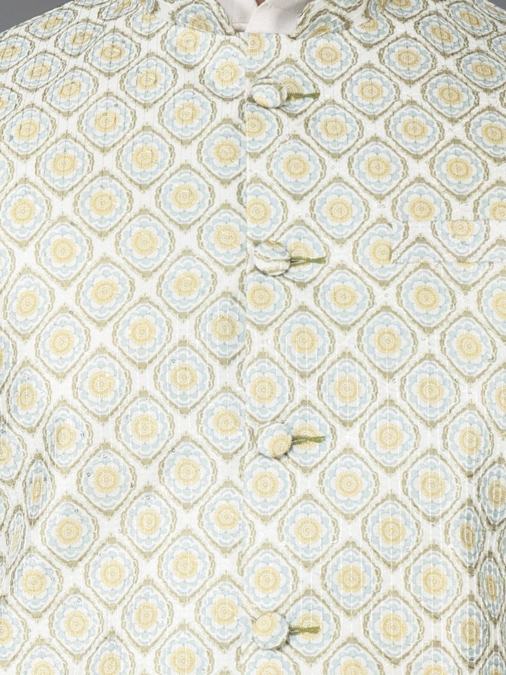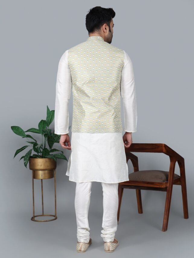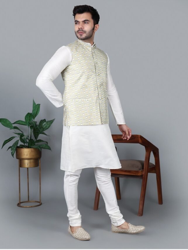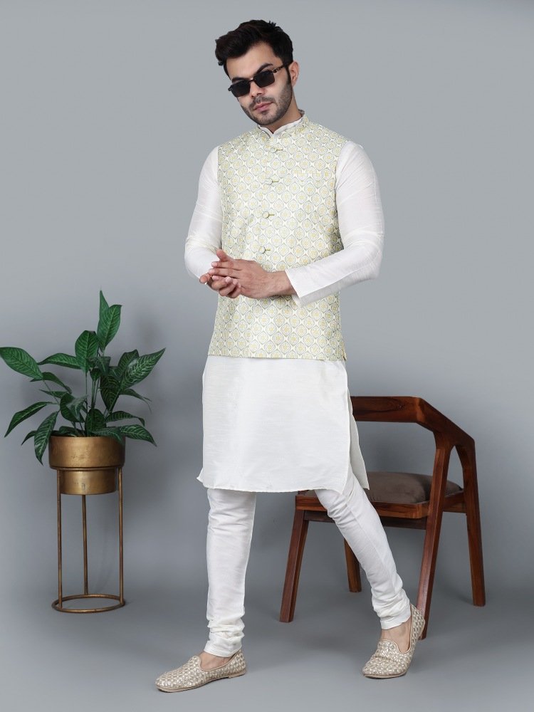 Men’s Cream Kurta Churidar with Yellow Printed Waistcoat