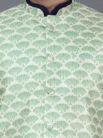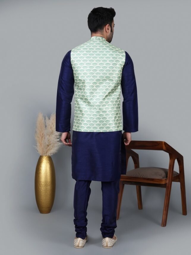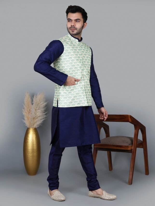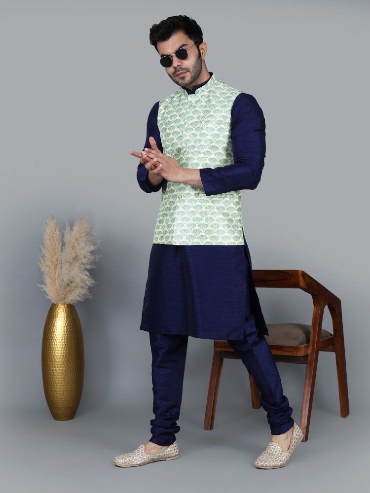 Men’s Navy Blue Kurta Churidar with Green feather printed Waistcoat